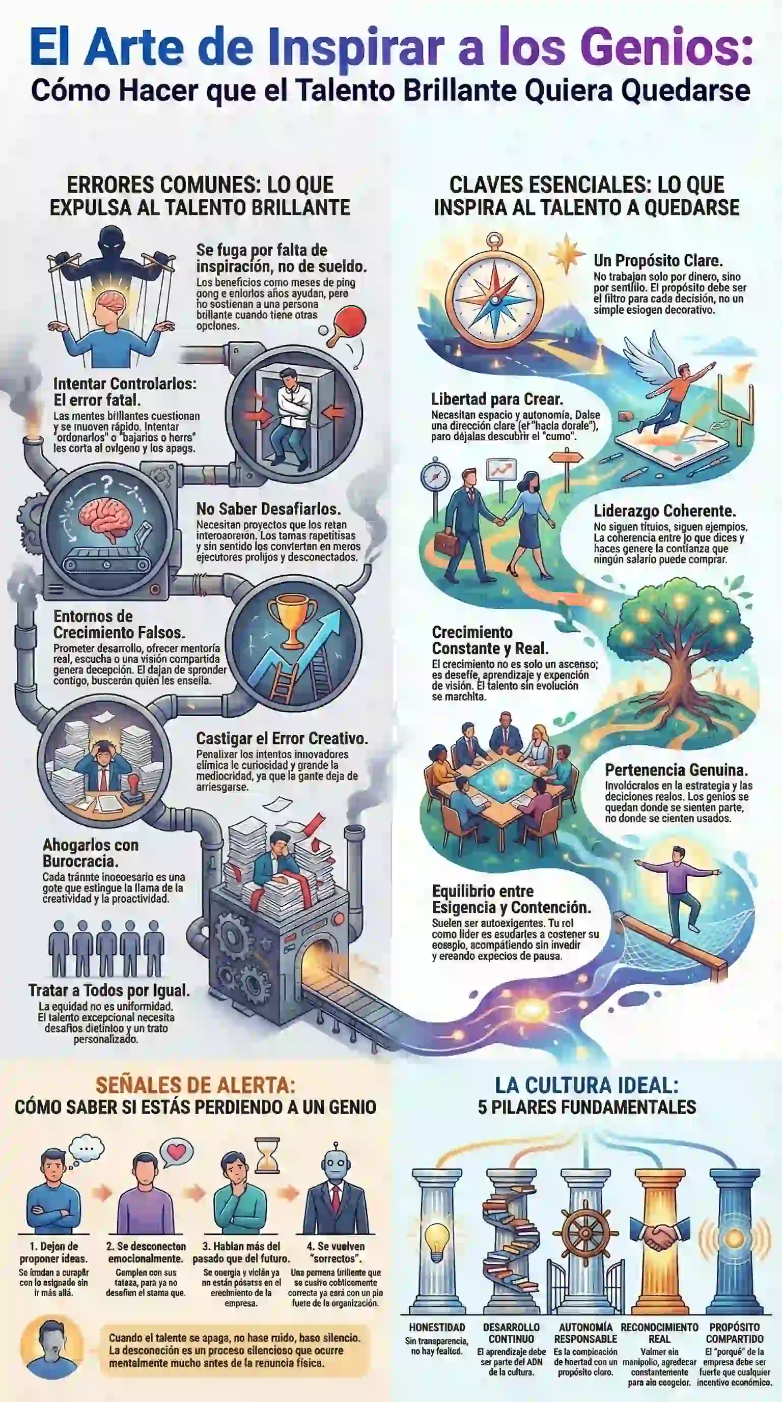 - Transparencia radical: Eliminar las agendas ocultas que el talento brillante detecta con sensibilidad.