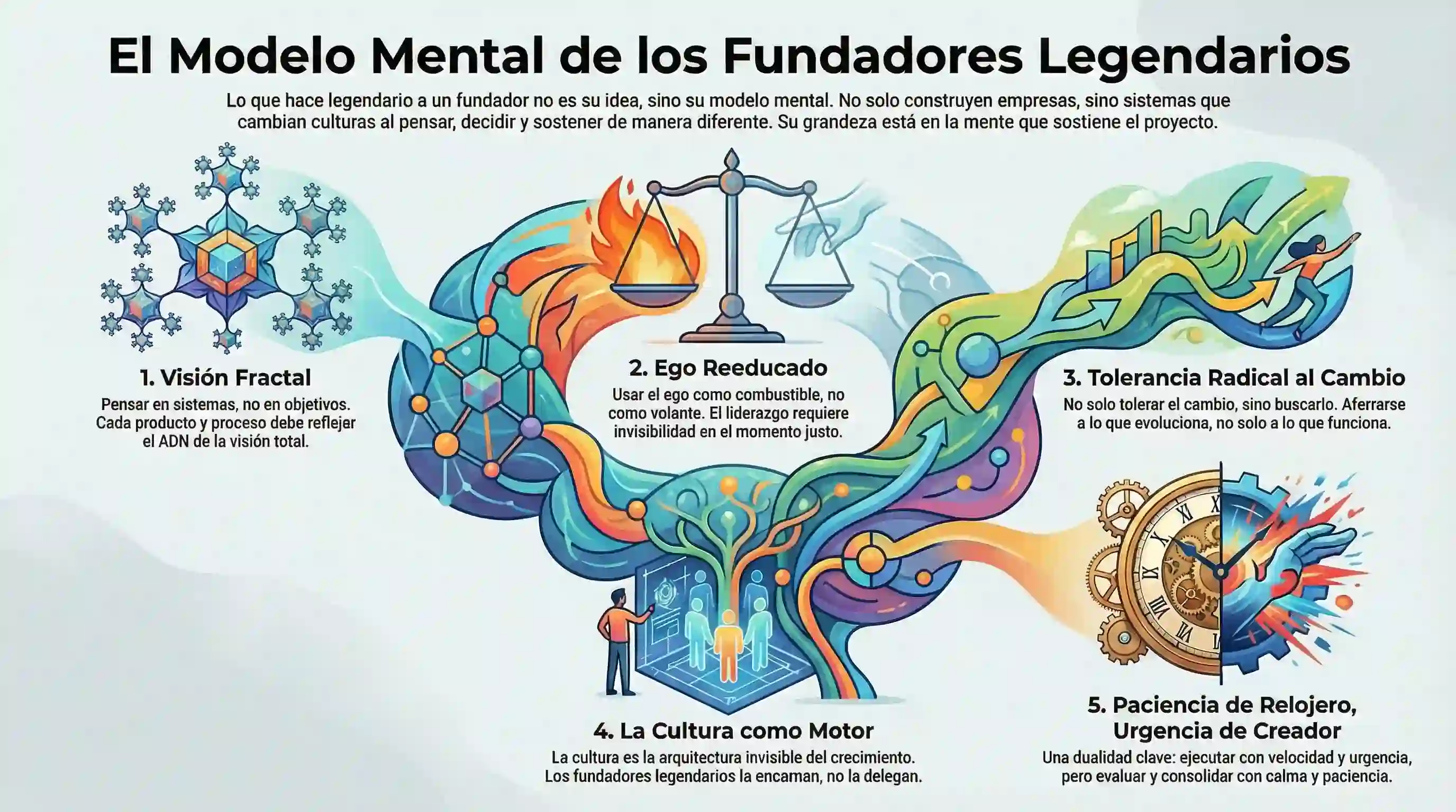 La tesis central es simple: el fundador legendario no piensa como empresario; piensa como arquitecto de sistemas bajo incertidumbre.