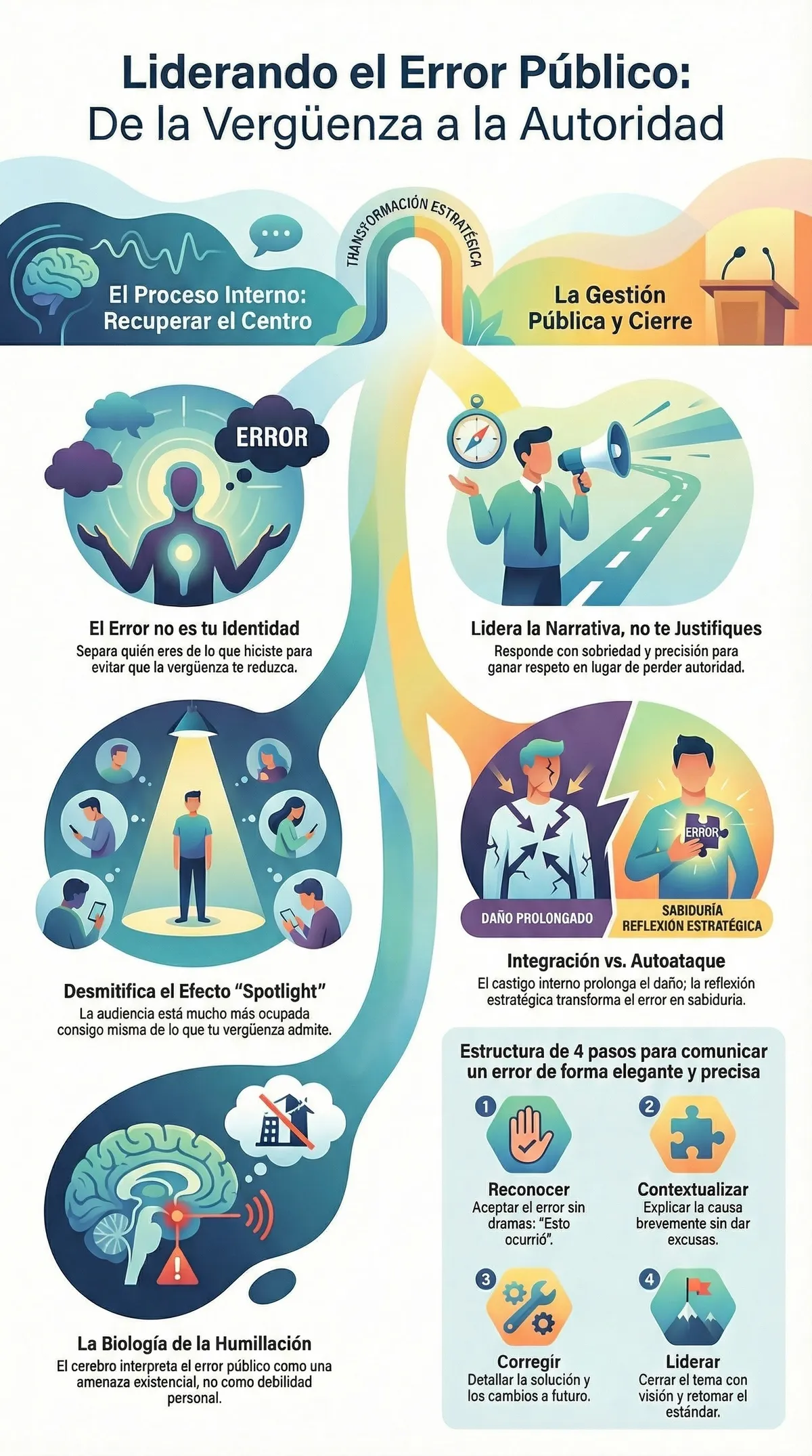 Cometer un error frente a otros —ya sea ante un equipo, un cliente, una audiencia o tu propia comunidad— es una de las experiencias más viscerales para cualquier profesional. En ese instante, bajo el calor de los reflectores, el ruido externo desaparece y quedas a solas con tu narrativa interna. Sin embargo, como estratega, te aseguro algo: el error público no mata tu reputación. Lo que realmente tiene el poder de aniquilarla es la vergüenza silenciosa que decides cargar y la gestión posterior del suceso. El liderazgo no se mide en la ausencia de fallos, sino en la integridad técnica y emocional con la que respondes cuando las cosas salen mal.