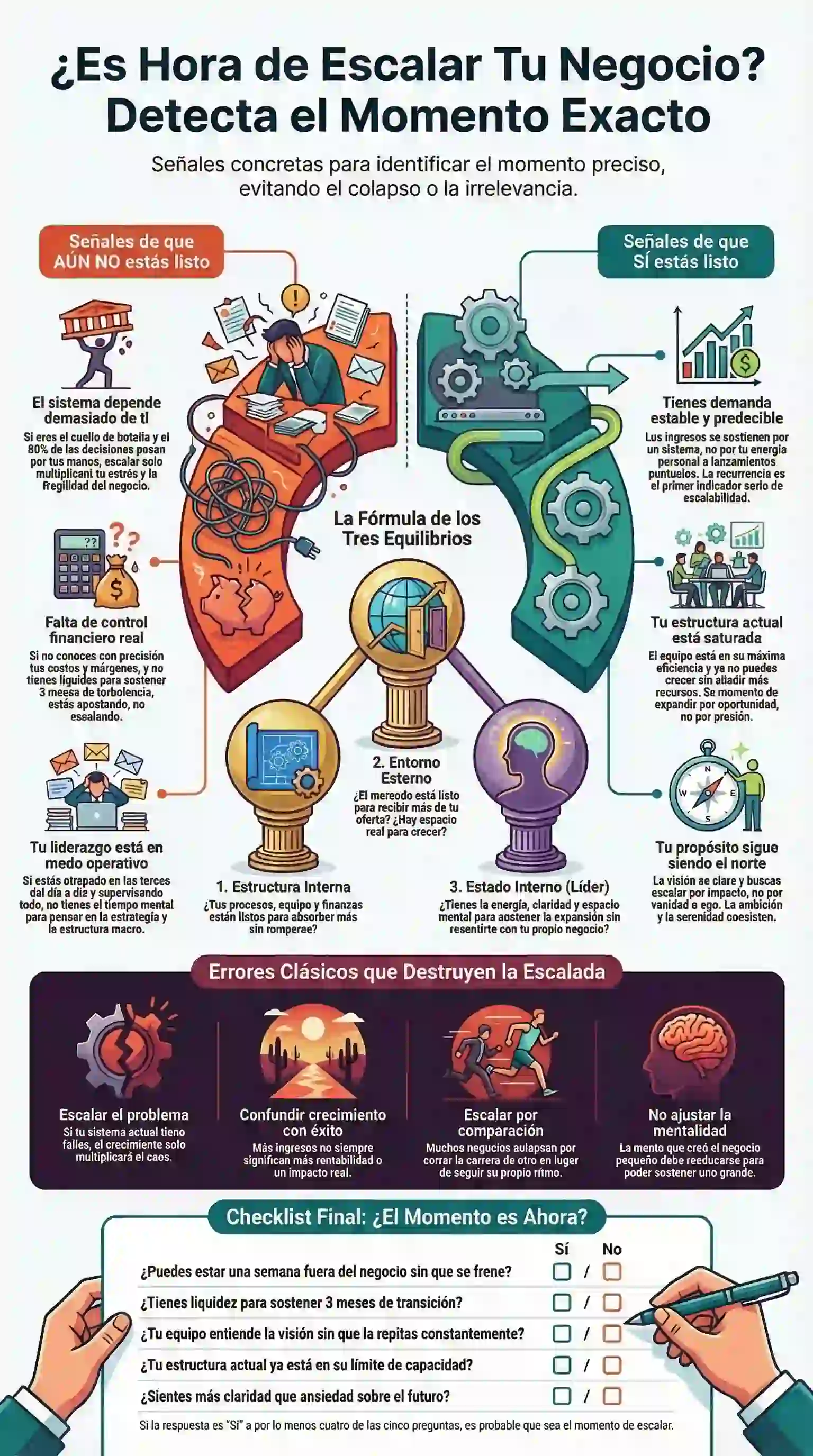 Detectar el momento exacto para escalar es una de las decisiones más difíciles y costosas en la trayectoria de cualquier empresa. No es una falta de información lo que complica el panorama, sino el exceso de ruido: opiniones ajenas, comparaciones con éxitos externos y, sobre todo, la presión del propio ego. Escalar no es simplemente vender más; es una decisión estratégica que puede elevar un negocio a nuevas alturas o, si se ejecuta sin la preparación adecuada, romperlo desde adentro.