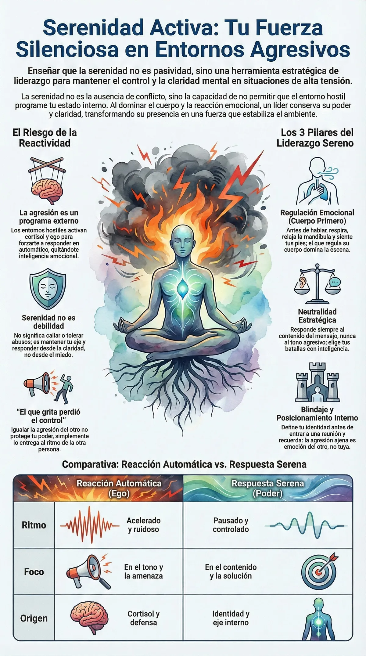 En el alto rendimiento, la serenidad no es un lujo; es una necesidad estratégica. Si el entorno te define, has perdido tu liderazgo interno. La agresión externa es la emoción del otro, pero la serenidad es tu identidad. Cuando desarrollas esta fuerza silenciosa, tu sola presencia incomoda a los agresivos y atrae a las personas inteligentes.Reflexión final: ¿Qué parte de tu soberanía interna le estás entregando hoy a tu entorno por el simple hecho de reaccionar en automático?