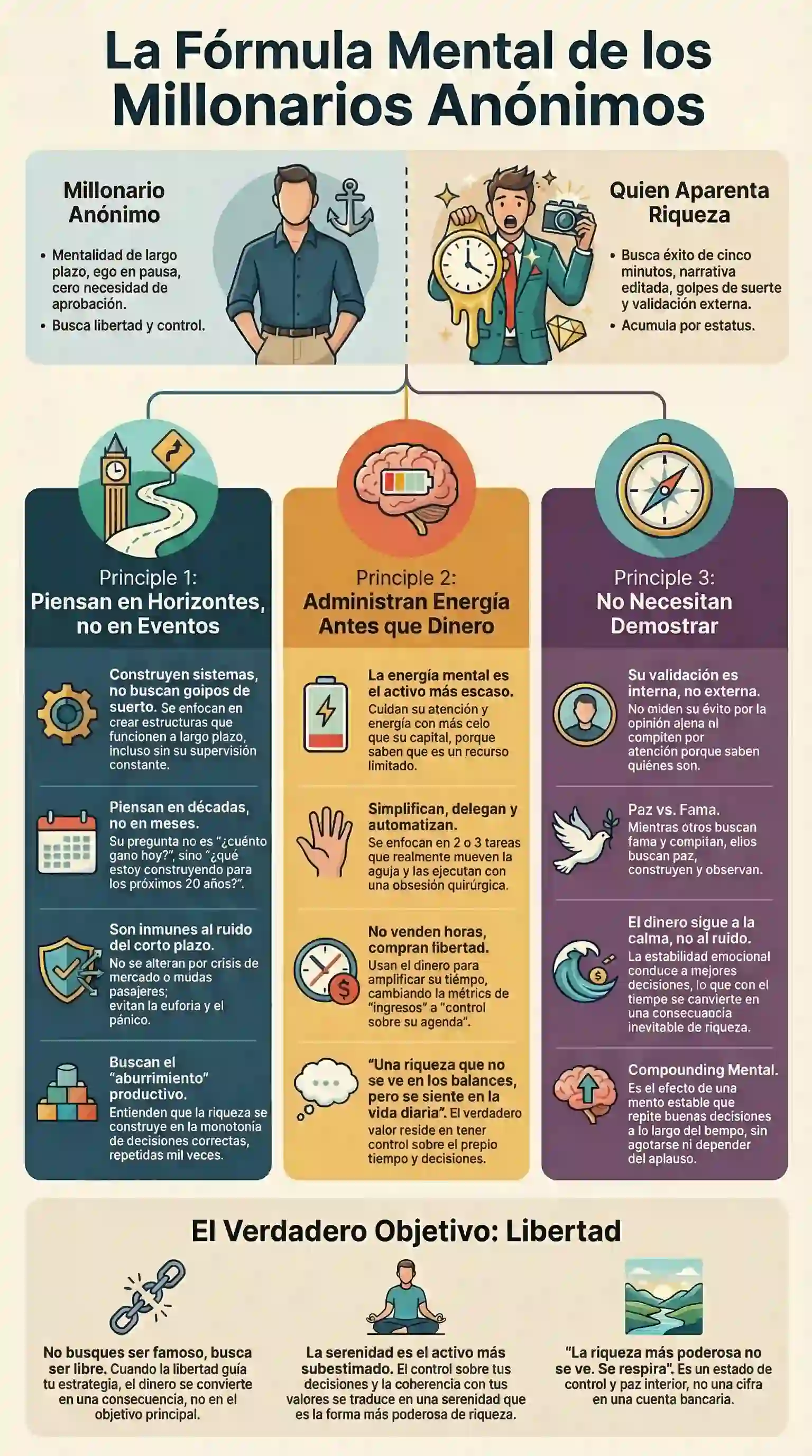 Al final del día, la métrica definitiva de tu estrategia financiera debe ser el control y la coherencia con tus propios valores. Los que necesitan que el mundo vea su éxito suelen perderlo en el ruido de sus propias necesidades emocionales; los que lo construyen en el anonimato, lo disfrutan en una paz absoluta.