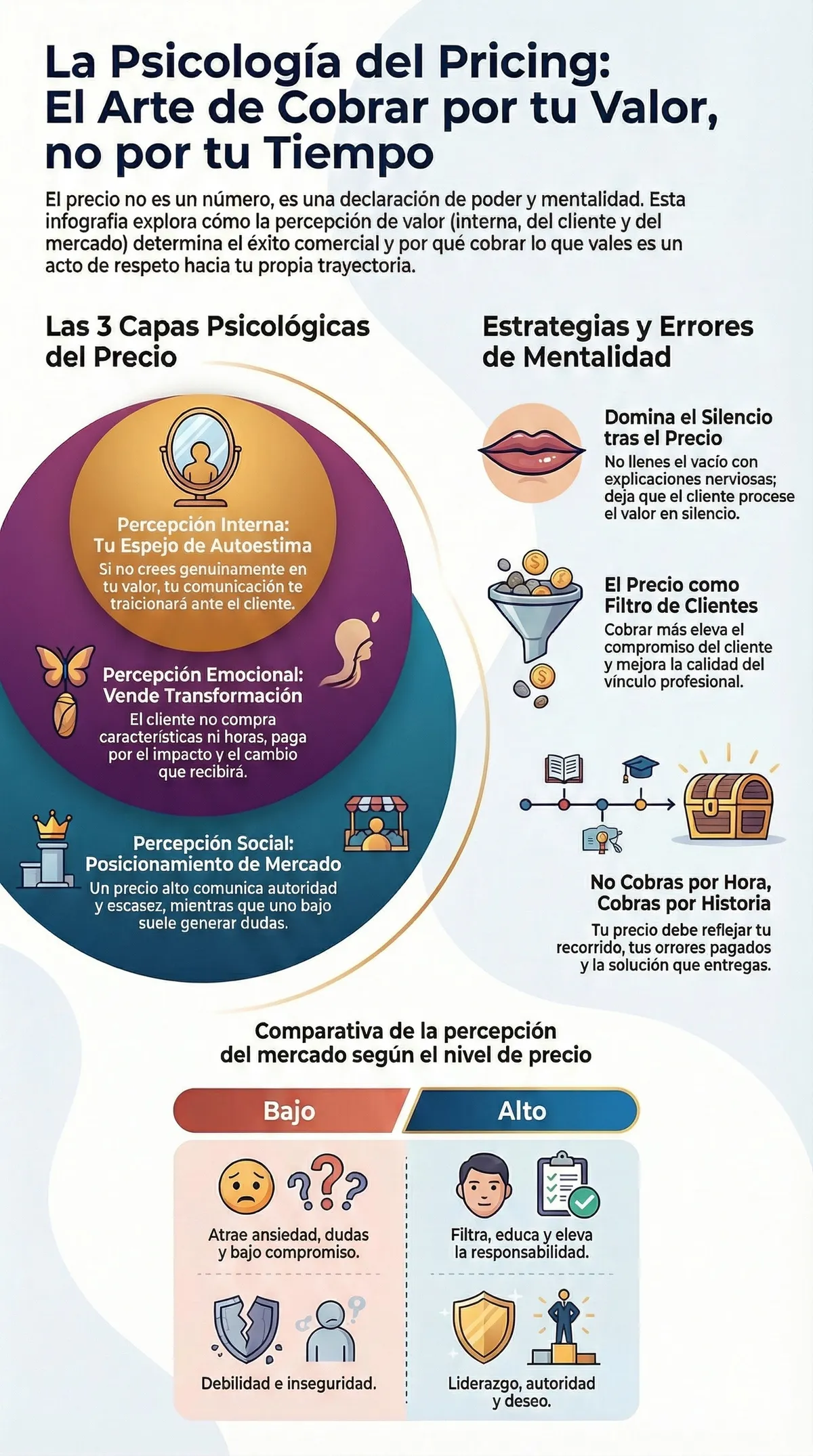 Fijar precios no es un ejercicio matemático, sino un diagnóstico definitivo de tu salud mental y tu autopercepción profesional. El error letal de la mayoría es establecer tarifas desde el miedo, la comparación o la urgencia por agradar. Esta inseguridad no solo reduce tus ingresos, sino que impone un costo psicológico devastador: te convences de que el mercado no está preparado, cuando en realidad eres tú quien no puede sostener ese valor internamente. El pricing es 100% psicológico ; si tu voz tiembla al decir el número, no estás comunicando un costo, estás proyectando tu falta de certeza.