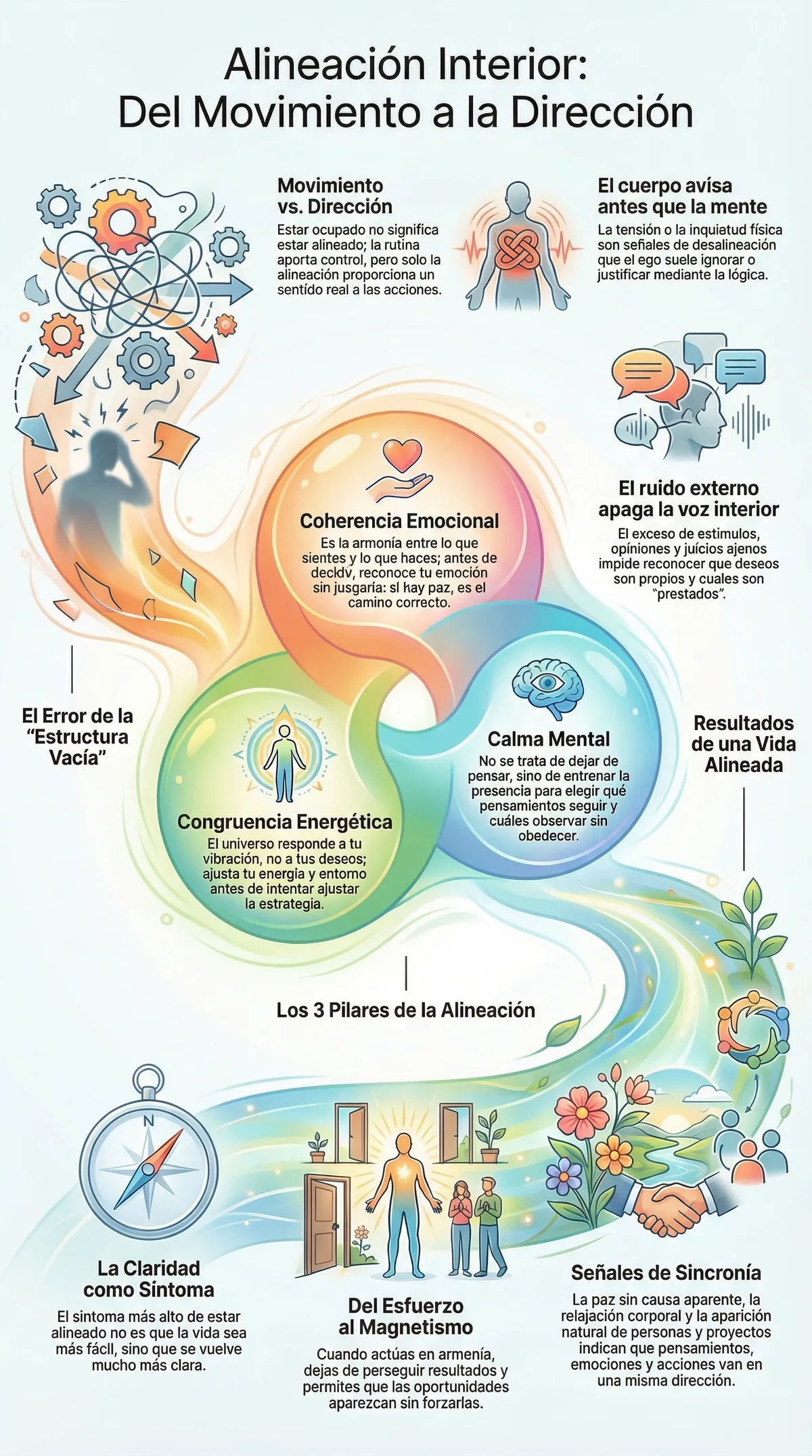 La verdadera coherencia nace en el silencio. Estar alineado significa que lo que piensas, lo que sientes y lo que haces caminan exactamente en la misma dirección. No es perfección, es integridad. El indicador real de éxito no es el aplauso externo, sino una sensación de "paz sin causa aparente" y una confianza que no necesita demostraciones lógicas ante nadie.