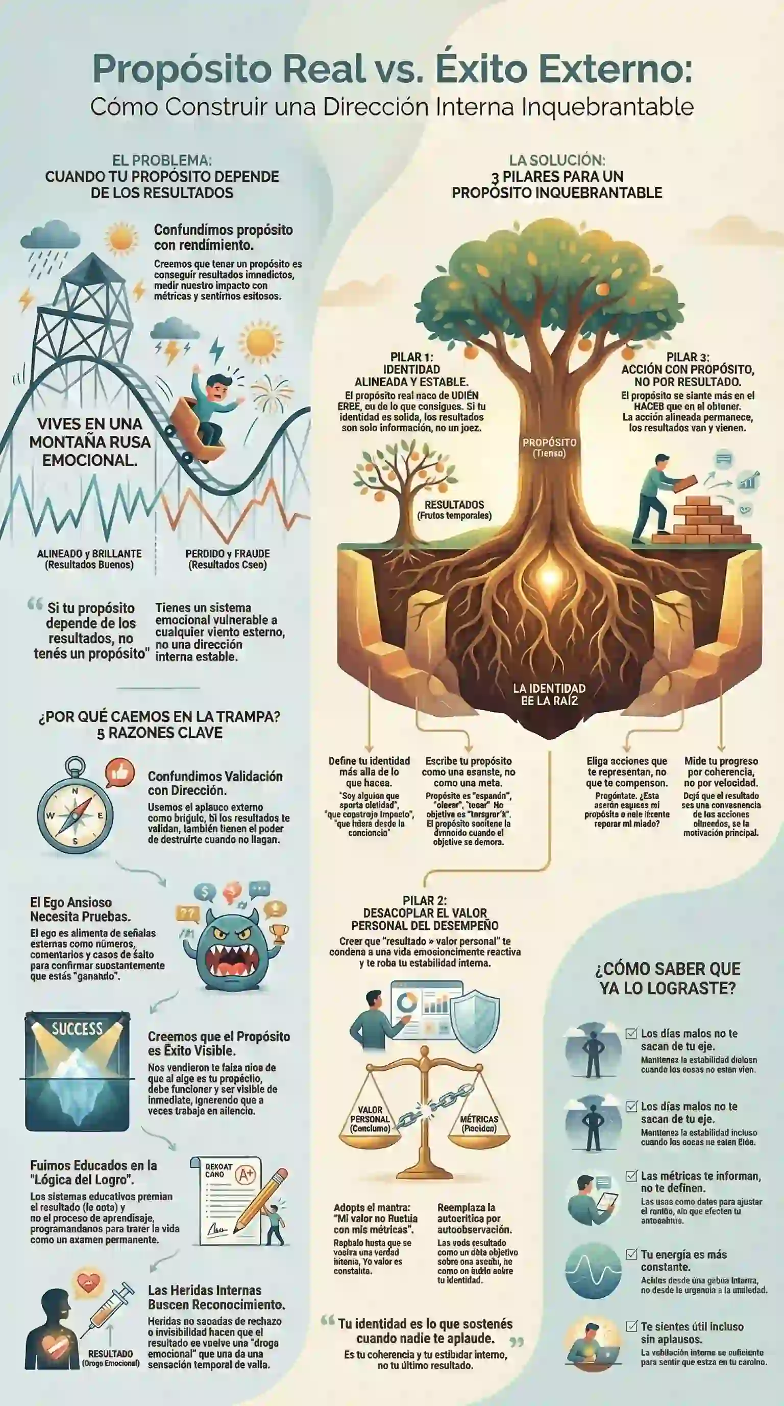 El problema central no es la falta de éxito, sino la confusión entre propósito y performance. Hemos sido programados para valorar nuestro impacto únicamente a través de métricas inmediatas, lo que genera un sistema emocional frágil y dependiente. El objetivo de este análisis es enseñarte a construir una dirección interna sólida: una infraestructura del "ser" que no se derrumbe ante los vaivenes del mercado o el ruido de los fracasos temporales.