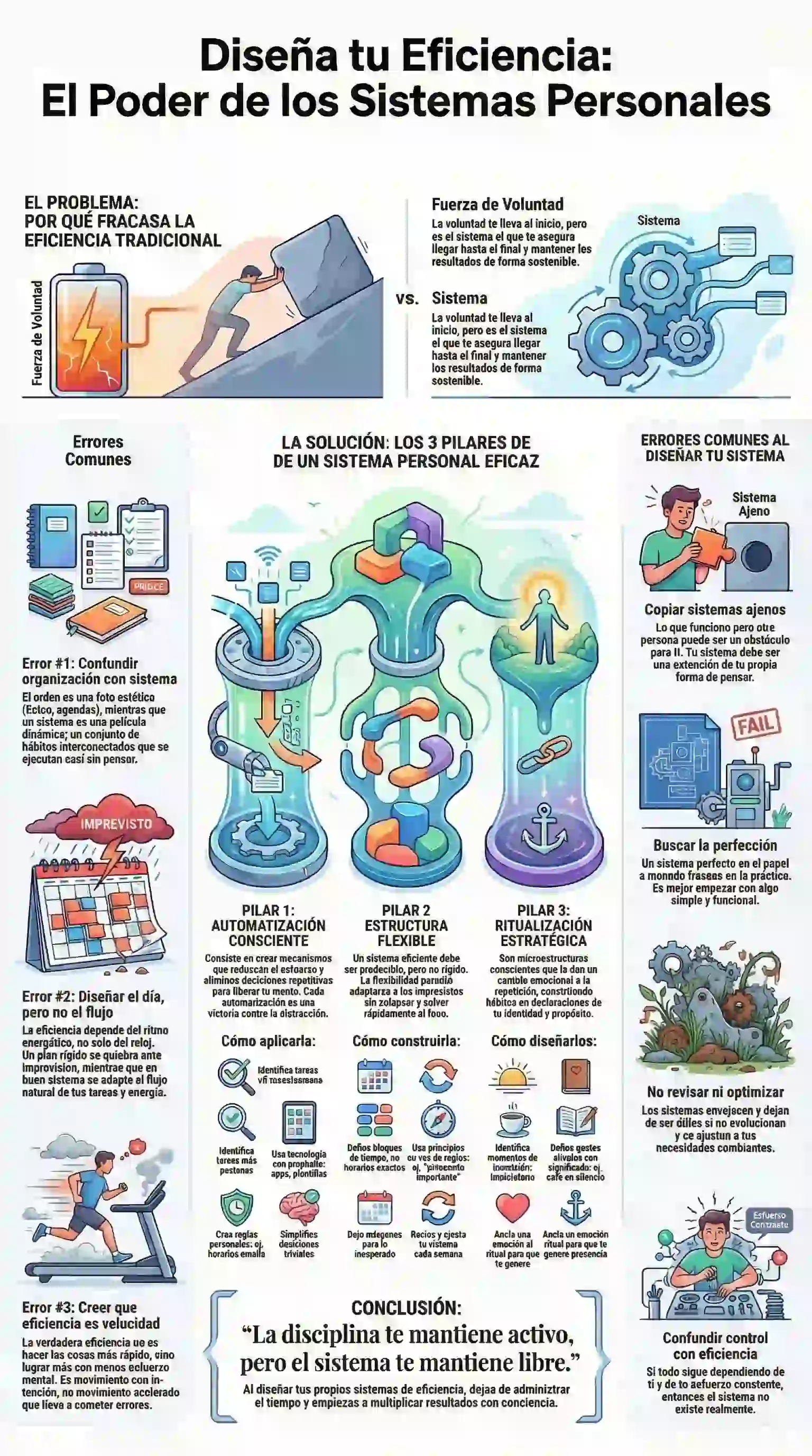 "La disciplina te mantiene activo, pero el sistema te mantiene libre." Al diseñar tus propios mecanismos de eficiencia, dejas de ser un administrador de minutos para convertirte en un multiplicador de resultados.