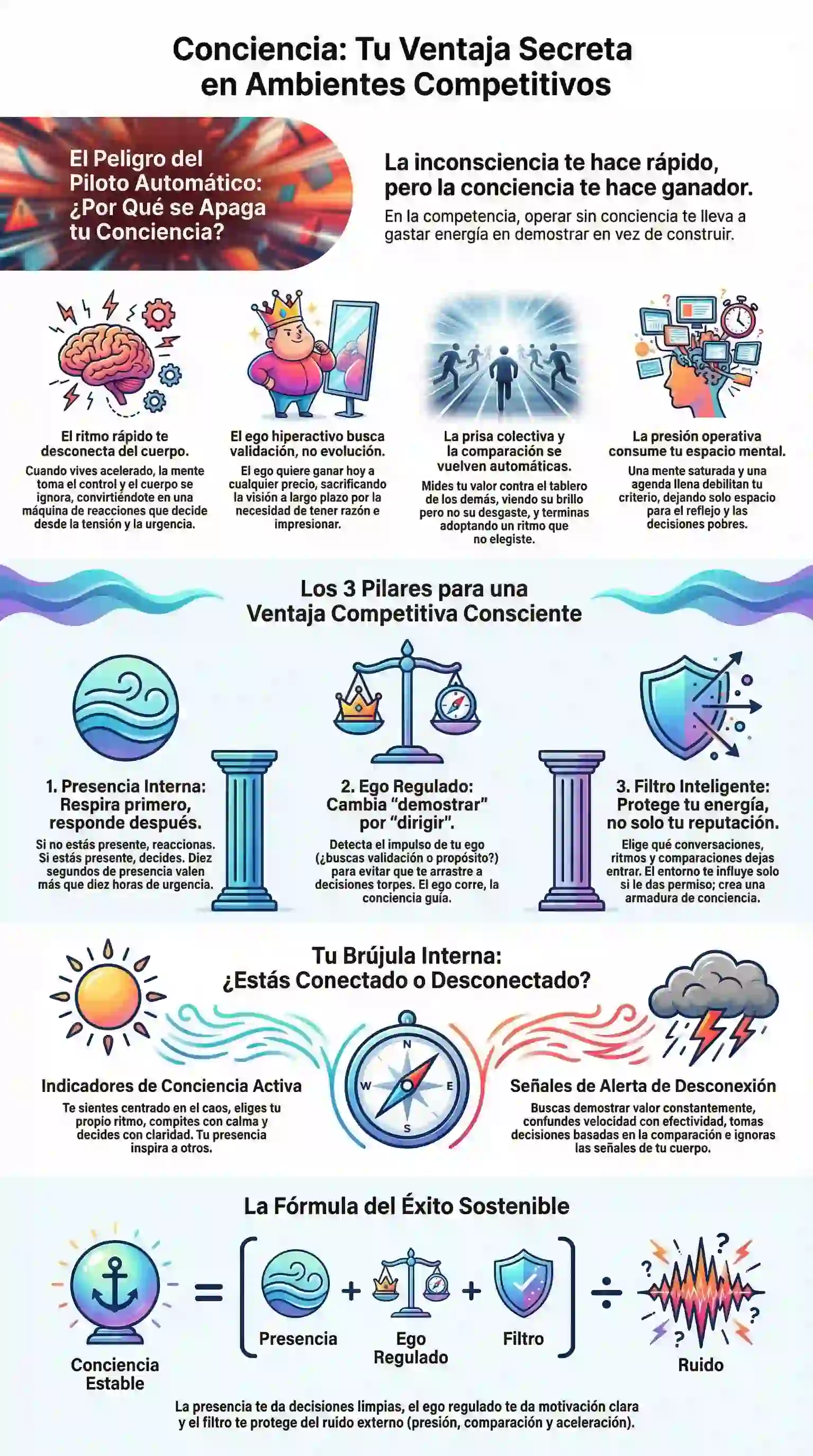 El Ego busca admiración y validación; la Conciencia busca dirección y coherencia. Un ego no regulado te empuja a prometer de más, a hablar cuando conviene callar y a demostrar en lugar de construir.