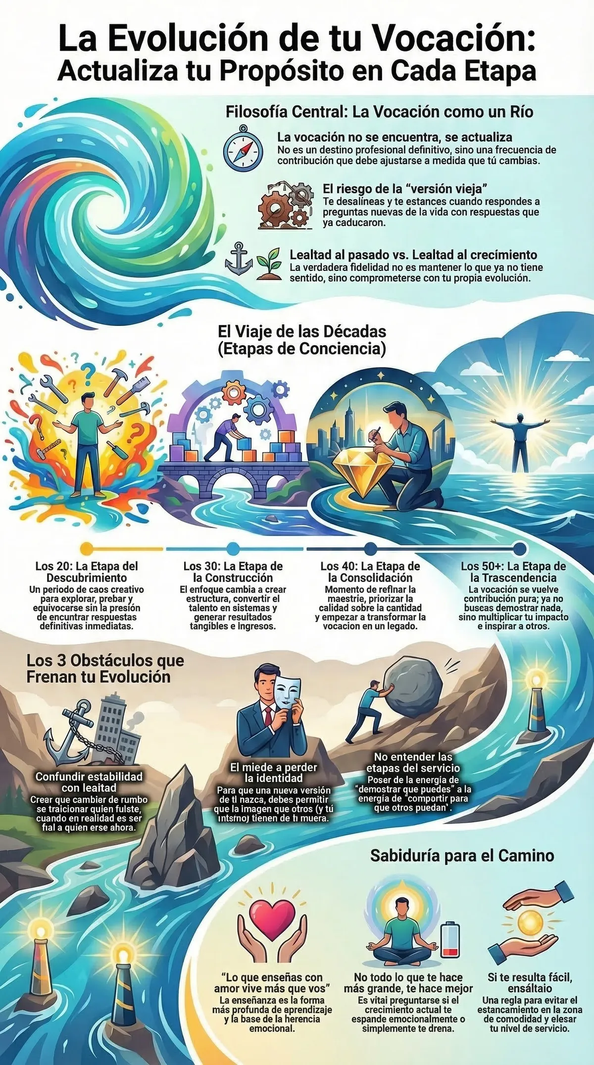 Tu vocación es como un río: su naturaleza es el movimiento. Si intentas congelarlo en una sola forma, un solo título o un solo cargo, se estanca y deja de ser vida. El miedo es lo único que bloquea esta evolución; todo lo demás en la existencia te empuja a crecer.Honrar tu vocación no significa repetirla eternamente por fidelidad a una versión tuya que ya no existe. Se honra permitiéndote evolucionar con ella. Cuando lo haces, la vida empieza a abrir puertas que tu versión anterior ni siquiera era capaz de ver.¿En qué etapa de esta conversación te encuentras hoy? ¿Estás intentando abrir las puertas de hoy con las llaves que usabas hace diez años?